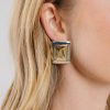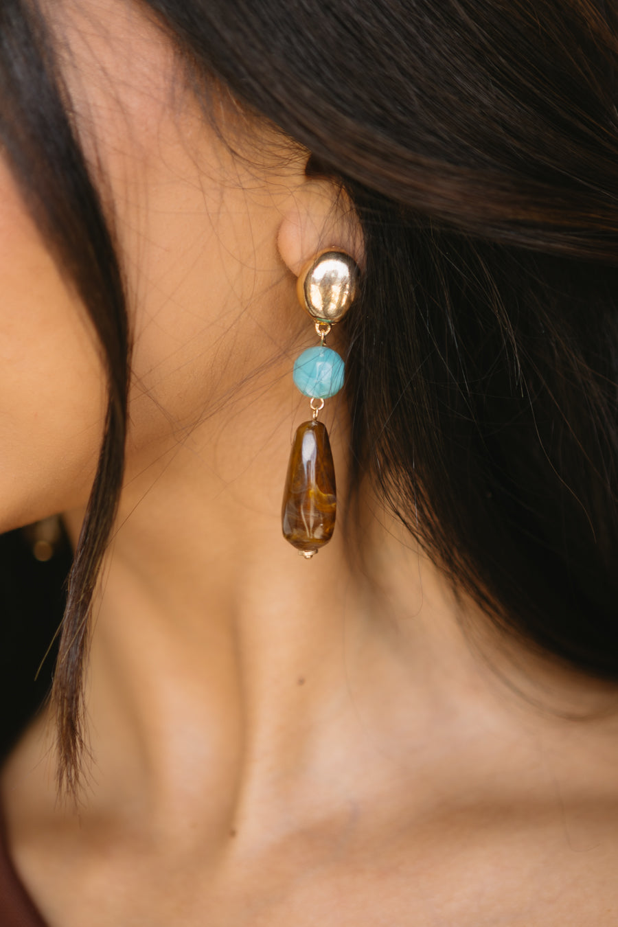 Post backing on gold metal with turquoise and brown marbled beads hanging down